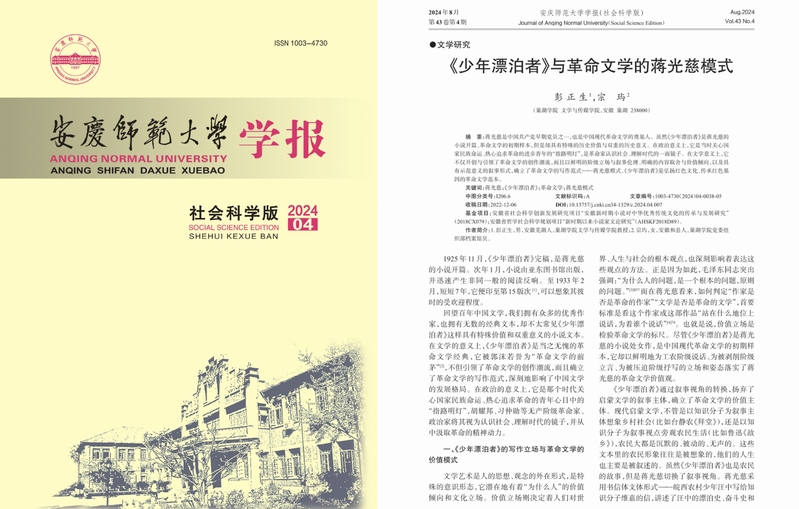 彭正生教授在《安庆师范大学学报》(社会科学版)2024年第4期发表题为《〈少年漂泊者〉与革命文学的蒋光慈模式》的研究论文。