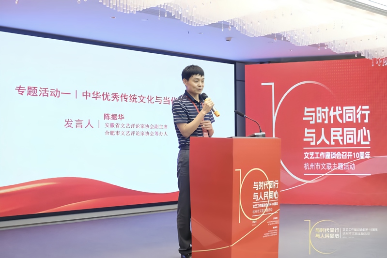 为庆祝新中国成立75周年和文艺工作座谈会召开10周年,2024年9月27日至29日,由杭州市文学艺术界联合会和浙江省文艺评论家协会主办,杭州市文艺评论家协会、杭州市临安文学艺术界联合会、杭州师范大学文化创意产业研究院承办的“与时代同行,与人民同心”——文艺工作座谈会召开10周年杭州市文联主题活动成功举行。基地研究员陈振华教授应邀参加会议,并在“中华优秀传统文化与当代文艺评论”专题发言。