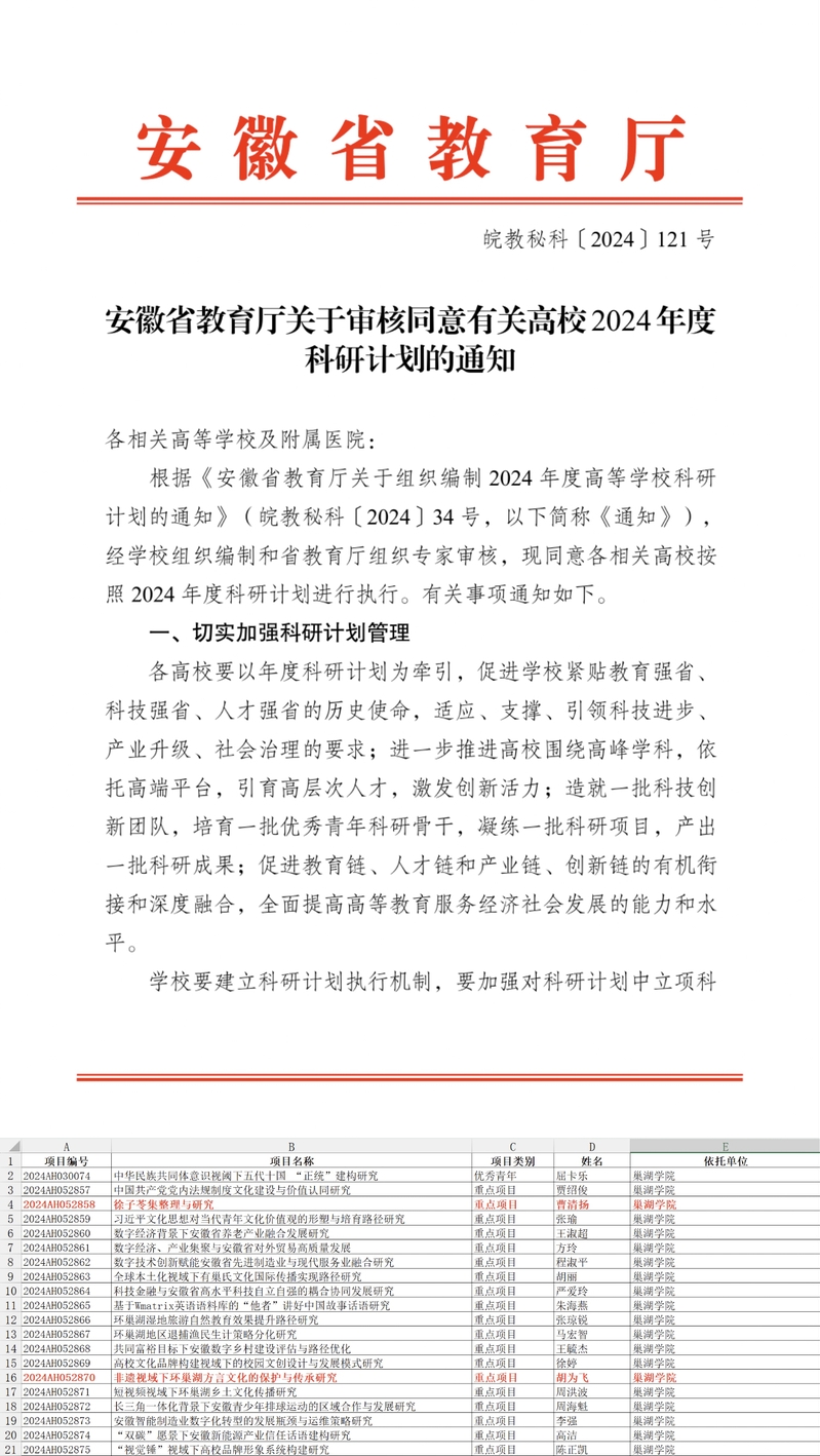 根据《安徽省教育厅关于审核同意有关高校2024年度科研计划的通知》,基地研究员曹清扬、胡为飞申报的课题获批2024年安徽省教育厅重点项目。
