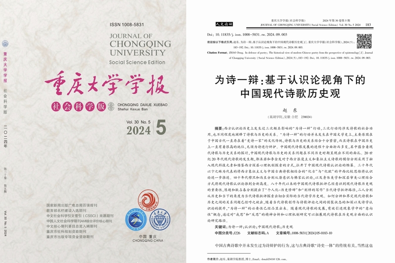 赵东教授在《重庆大学学报》(社会科学版)2024年第5期发表题为《为诗一辩:基于认识论视角下的中国现代诗歌历史观》的研究论文。
