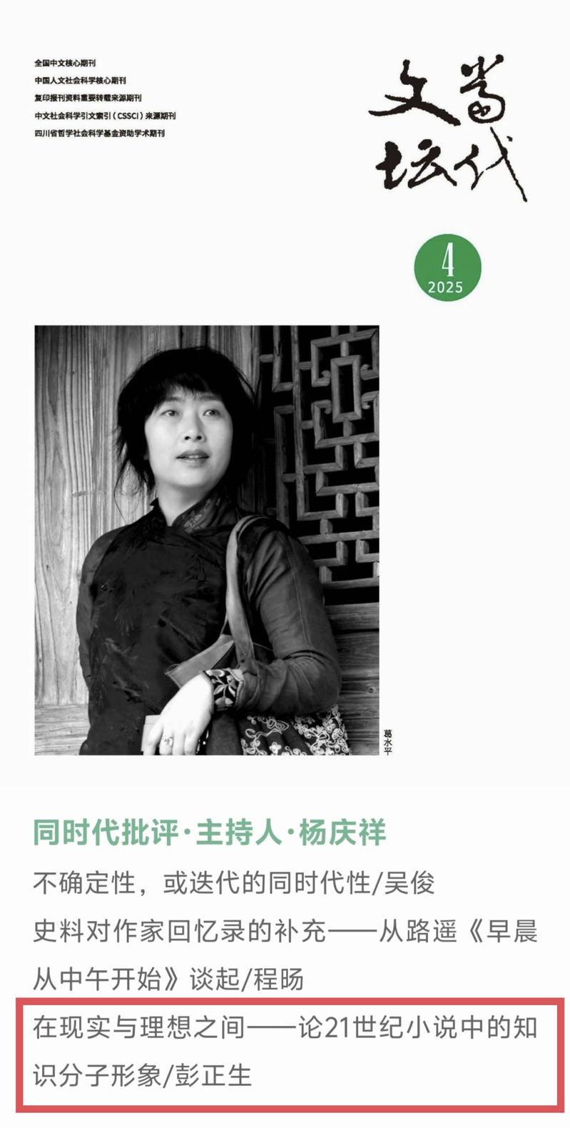 基地研究员、文学与传媒学院中文系汉语言文学专业教授彭正生在《当代文坛》2025年第4期发表题为《在现实与理想之间——论21世纪小说中的知识分子形象》的研究论文。(文、图/康富强 初审/刘康凯 终审/彭正生 发布/康富强)