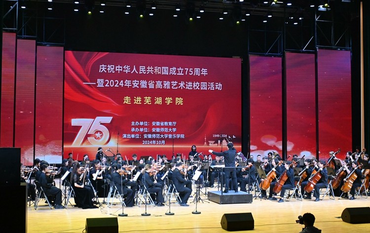 10月24日晚,由安徽省教育厅主办的“庆祝中华人民共和国成立75周年暨2024年安徽省高雅艺术进校园”活动在伟德艺术中心顺利举办。安徽师范大学交响乐团受邀为现场师生带来了一场高雅的视听盛宴。校领导左方敏,部分职能部门负责人及八百余名师生代表共同观看了演出,近距离感受高雅艺术的独特魅力。