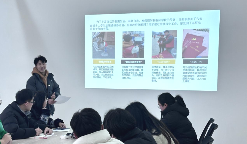 首先,张铮传达了会议精神,并简要介绍了会议流程。随后依托学院“以青春之名,赴家乡之约”社会实践活动,开展“我的实践故事”分享主题党日活动。2021级电子信息工程专业学生王家和、2022级电子信息工程专业曹舒畅以及2022级微电子科学与工程专业瞿星晨三位同学通过PPT分享了自己假期的实践与成长,从身边小事出发,社区义务劳动、道路扫雪清障、关爱空巢老人等一个个善举让严寒的冬天饱含温暖。随后与会党员积极发言,结合日常生活、假期趣事等方面畅所欲言。
