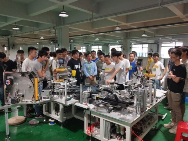 荚长慧代表中显公司欢迎大家的到来,并带领同学们逐一参观了公司的专利成果展厅、生产车间、科技展馆、员工健身娱乐室等地。期间荚长慧带领同学们对正在安装调试的某智能生产线进行了参观,并请师傅详细介绍机器的工作原理和动作过程。在见习过程中,同学们认真听讲,主动与公司技术人员进行互动交流。