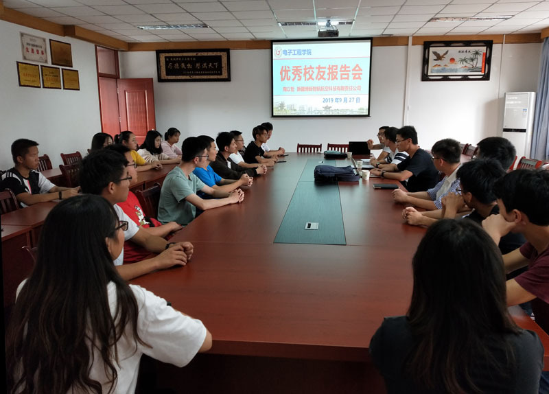 2019年9月27日下午,2017届电气工程及其自动化专业毕业生、航模协会会长(2014-2016年)、优秀校友陶以哲(现新疆博新智航航空科技有限责任公司经理)应电子工程学院邀请,进行航空(无人机设计)相关行业就业创业经验报告。电子工程学院党委副书记孔鲲鹏主持了本次报告会,航模协会师生共同参与了本次报告会,并与陶以哲经理就技术设计、从业经验进行深入交流。