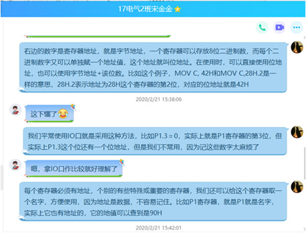 本学期任玲芝老师主讲《电路》和《单片机原理及应用》两门课程。任老师认真地比较各类学习平台的使用效果,最后确定使用钉钉+学习通+QQ群组合完成课程教学任务。通过钉钉平台发起课程直播教学,并与学生在线互动;通过学习通平台,发布签到、视频课程资源、作业和章节测试;学生通过QQ群随时向任老师问问题,任老师也会在第一时间解答学生问题。