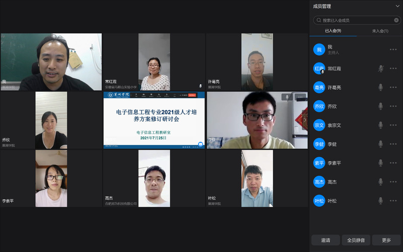 为进一步提高人才培养质量,推动工程教育认证理念, 7月25号下午,电子信息工程教研室以钉钉会议的形式再次召开2021级人才培养方案修订研讨工作,会议由教研室主任孔兵主持,副院长叶松和电信教研室全体教师参加了会议。