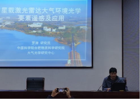 罗涛研究员作了题为《星载激光雷达大气环境光学要素遥感及应用》的报告。报告介绍了激光雷达的原理与种类,讲解了常见星载激光雷达的波段、参数以及应用领域,展示了课题组利用星载激光雷达在沙尘气溶胶、云微物理特征、气溶胶-云相互作用等方面取得的最新研究进展。报告高屋建瓴,成果意义重大。罗涛研究员勉励学生学好基础知识,为以后的科学研究打下坚实的基础。