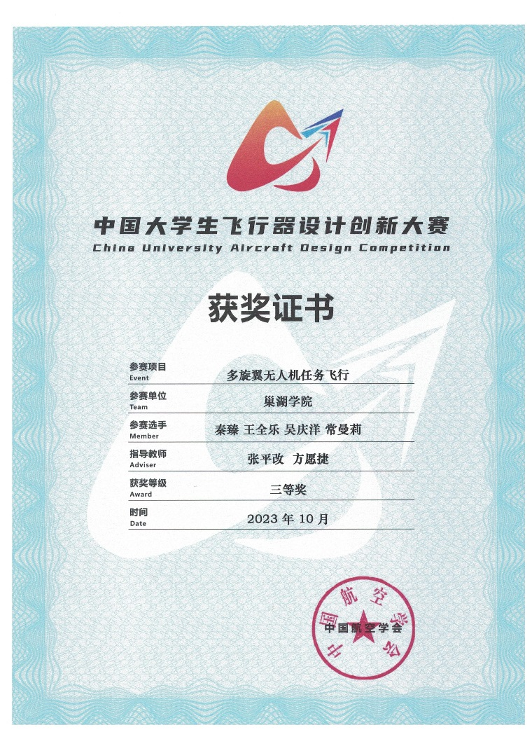 2023年10月3日,由中国航空学会主办的中国大学生飞行器设计创新大赛(全国总决赛)在河北定州圆满落幕。来自全国88所高校的3000名选手以“凌云创智、空天争锋”为主题展开角逐。自本赛事发布,电子工程学院领导高度重视,暑假留校30余学生积极备战。经东部赛区选拔,航模协会在多旋翼无人机任务飞行、电动滑翔机控制飞行与创新设计报告评比等项目中获得二等奖1项、三等奖3项,其中3支队伍入选全国总决赛。经过激烈比拼,多旋翼无人机任务飞行机组在全国总决赛中获得三等奖。