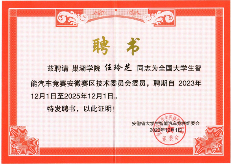 会上,安徽省大学生智能汽车竞赛组委会聘任任玲芝老师为竞赛组技术专家,这也是我校指导教师首次成为该项竞赛的技术组成员。