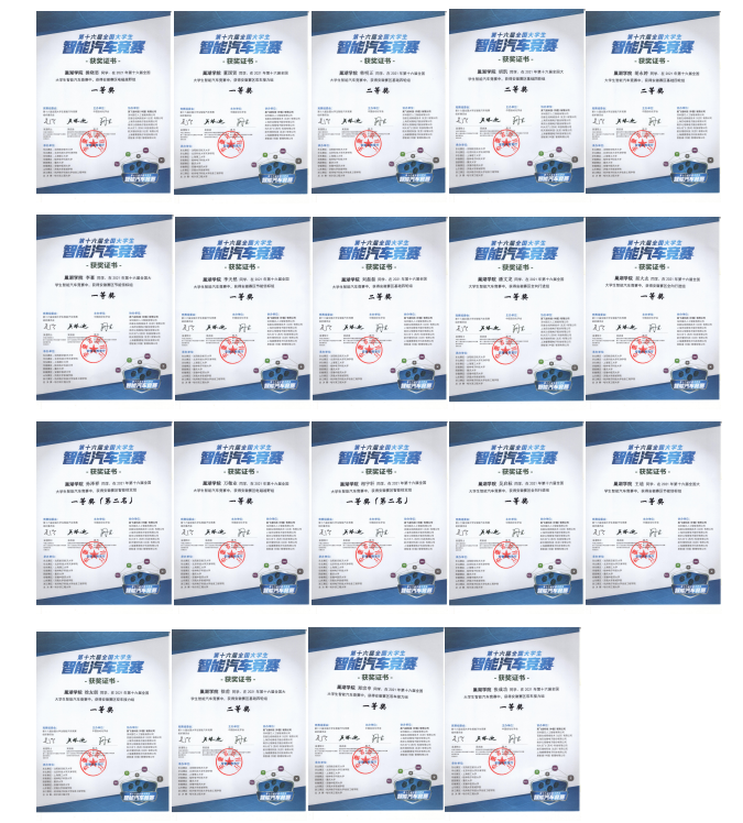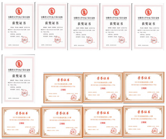 过去的一年里,在学校的大力支持以及指导老师的指导下,电子创新设计协会成员凭借自身的努力在全国大学生电子设计竞赛、全国大学生智能车竞赛和安徽省机器人大赛中取得了如下成果:国家一等奖一项,国家二等奖四项,安徽省一等奖八项,安徽省二等奖十二项,安徽省三等奖十七项。在比赛过程中,社员们有过挫折,有过遗憾,有苦有累,有哭有笑,但更多的是参赛过程中收获的知识、友谊及感悟。