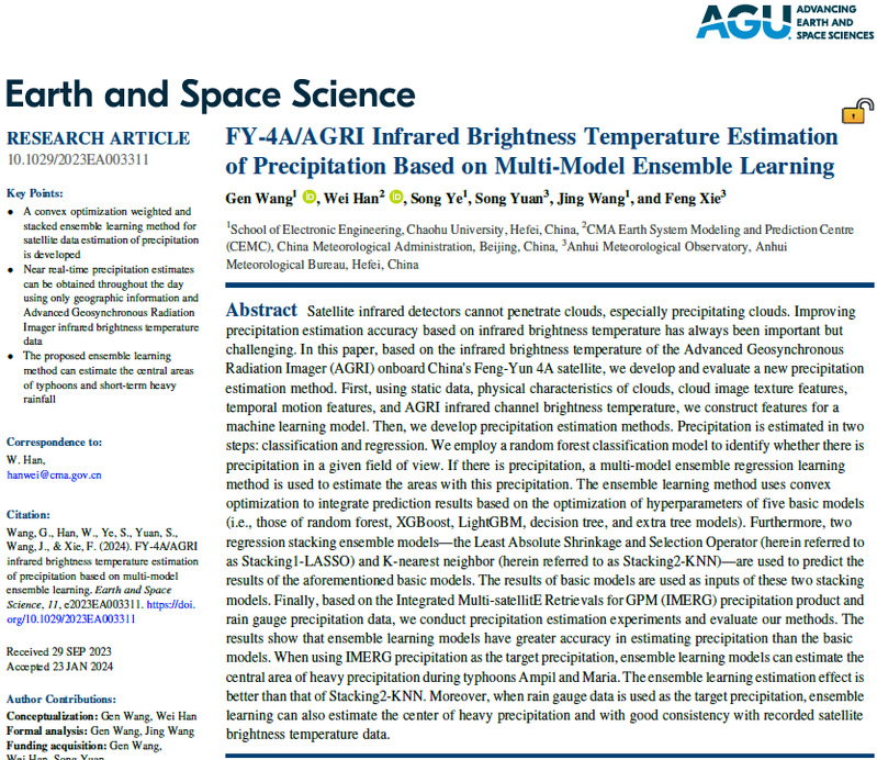 近日,电子工程学院遥感科学智能应用校级重点实验室王根博士联合中国气象局地球系统数值预报中心和安徽省气象台在人工智能模型用于风云气象卫星反演降水研究中取得进展,相关成果发表在国际权威期刊《Earth and Space Science》。该研究工作得到了安徽省重点研究与开发计划、安徽省高校杰青、国家基金委自然科学基金等项目的支持。