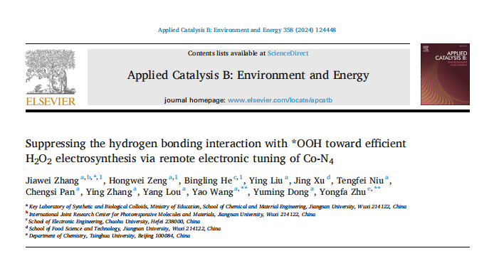 赫丙玲博士(共同第一作者)与江南大学朱永法教授团队合作研究了远程调控Co-N₄电子结构促进H₂O₂合成,相关研究成果发表在《Applied Catalysis B: Environment and Energy》(中科院一区TOP,IF=20.2)期刊。Co-N4电子结构在调节钴卟啉2e- ORR性能方面的作用,并构建共价连接策略来处理卟啉单体在恶劣操作条件下的聚集性质,特制的Co-TEPP-COP/rGO催化剂对H2O2表现出优异的选择性和耐久性,并实现了高效电催化合成H2O2。本研究对开发高效的2e- ORR电催化剂合成H2O2具有重要意义。
