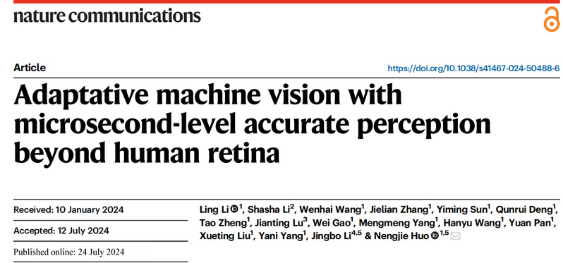 李莎莎博士(共同第一作者)与华南师范大学霍能杰研究员,浙江大学李京波教授团队合作研制了基于范德华异质结的视觉仿生晶体管,相关研究成果发表在Nature子刊《Nature Communication》(中科院一区TOP IF=16.6)杂志上。在雪崩隧穿机制和光电导机制的可控动态调节下,晶体管具有微秒级的精确感知,其环境光适应速度比人类视网膜适应速度快104倍以上。基于自适应视觉仿生晶体管的仿生视觉系统能够在危险环境中替代人眼进行感知和判断,在自动驾驶、面部识别和医学成像等领域具有巨大的应用潜力。