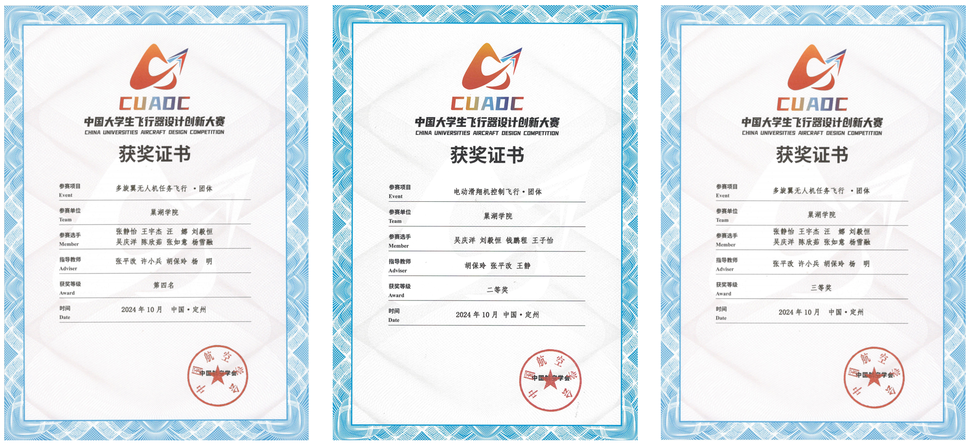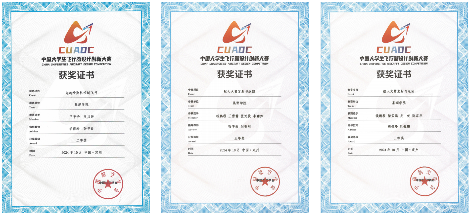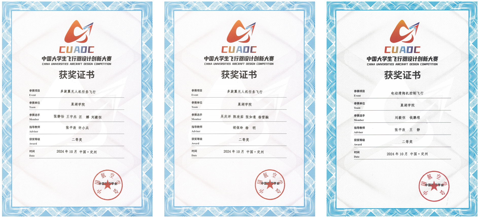 2024年9月27日-10月4日,由中国航空学会主办的2024年中国大学生飞行器设计创新大赛(CUADC)全国总决赛在河北省定州市举办。经全国5个赛区选拔,来自清华大学、北京航空航天大学、西北工业大学、南京航空航天大学等全国100余所院校的3000余名师生参加此次总决赛。电子工程学院航模协会指导教师张平改带队,吴庆洋、钱鹏程、刘毅恒等20余名学生组成的代表队参赛,并在多旋翼无人机任务飞行、航天火箭发射与返回等3个项目,获得全国二等奖4项、三等奖2项,并在团体赛中获全国第四名、二等奖、三等奖各1项,共计在9个奖项中取得优异成绩。