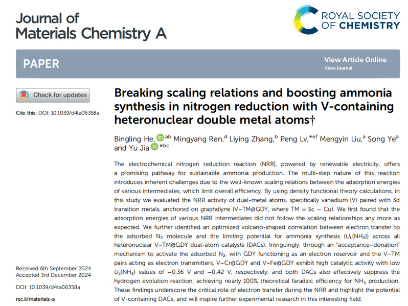近日,必赢76net官网光电能源催化材料与器件研究所赫丙玲副教授在电催化固氮研究上取得了重要突破,相关成果《Breaking scaling relations and boosting ammonia synthesis in nitrogen reduction with V-containing heteronuclear double metal atoms》发表在Journal of Materials Chemistry A。该杂志影响因子为10.7,中国科学院分区为二区TOP期刊。2020级物理学专业本科生任明阳为该论文第二作者。