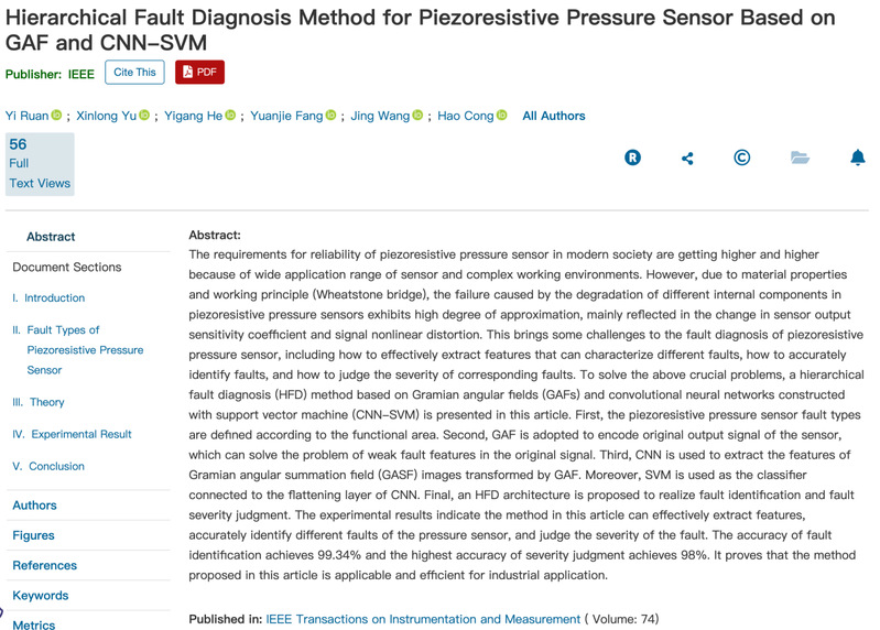 近日,电子工程学院阮义博士在仪器仪表领域高水平期刊《IEEE Transactions on Instrumentation and Measurement》(中国科学院分区:仪器仪表2区)上发表研究成果《Hierarchical Fault Diagnosis Method for Piezoresistive Pressure Sensor Based on GAF and CNN-SVM》。