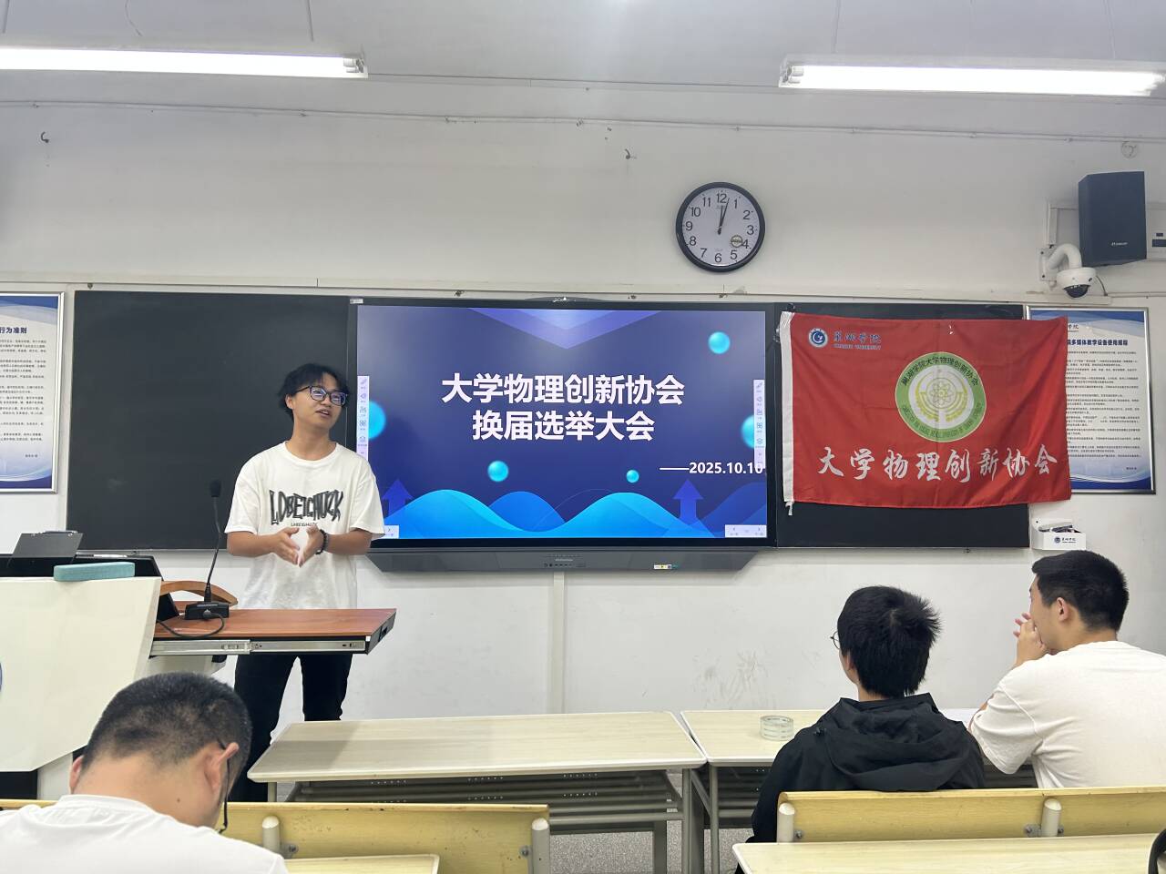 根据校团委和电子工程学院团委的部署,2025年10月15日中午,大学物理创新协会在博学楼113教室举办了社团换届大会。协会各部门干事以及会员近50人参与,协会指导老师杜成名到会指导,会议由干文海主持。