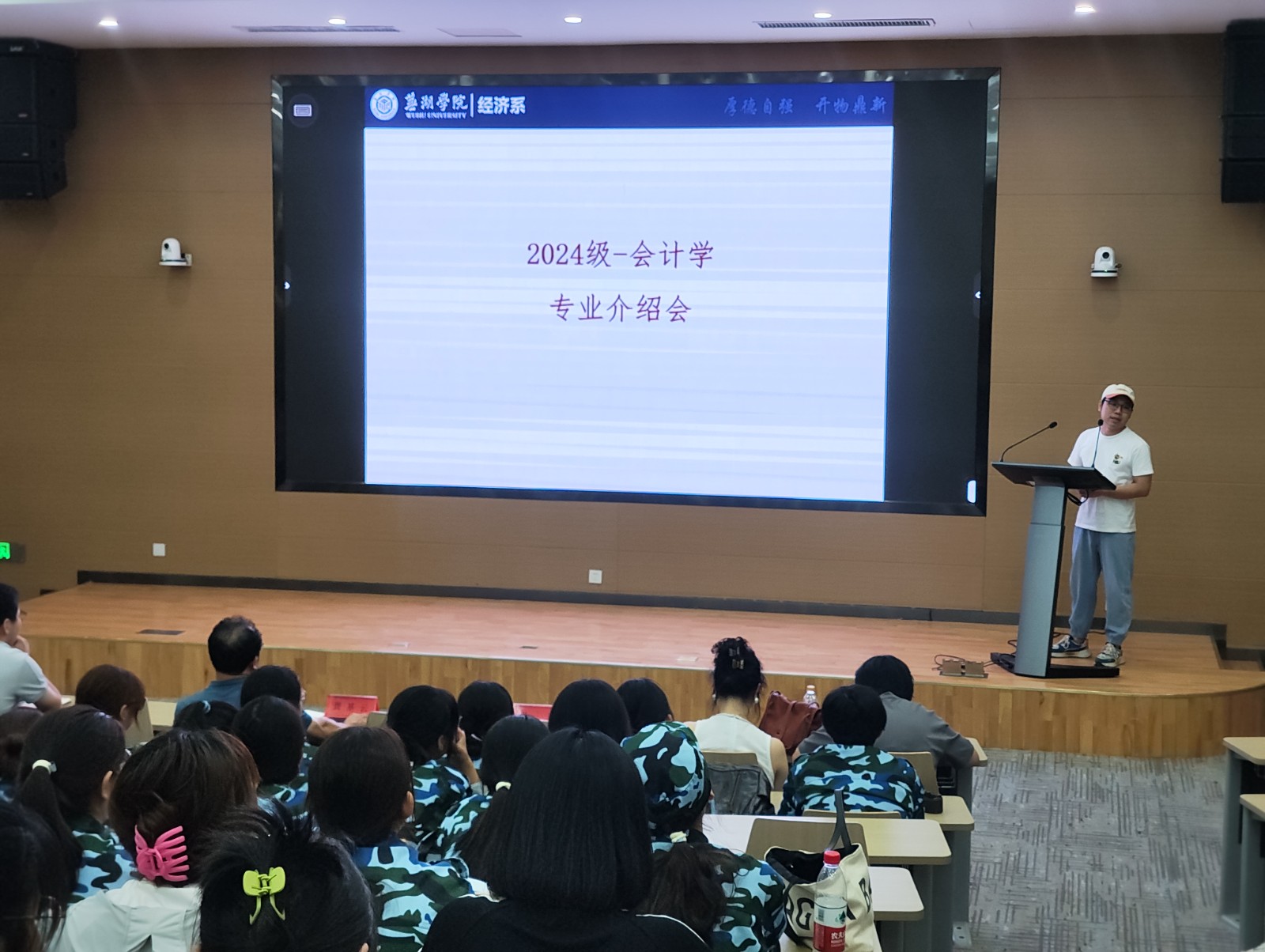 为了让2024级新生加深对所学专业的理解与认同,尽早适应大学生活、做好学习规划,经济系9月9日下午2点9号楼报告厅召开新生入学专业介绍会。参加活动的有经济系主任龚基云,副书记李运鑫,财务管理专业负责人濮兆平,会计学专业负责人张洋,新生辅导员祝松以及全体新生,活动由教学秘书祖璇主持