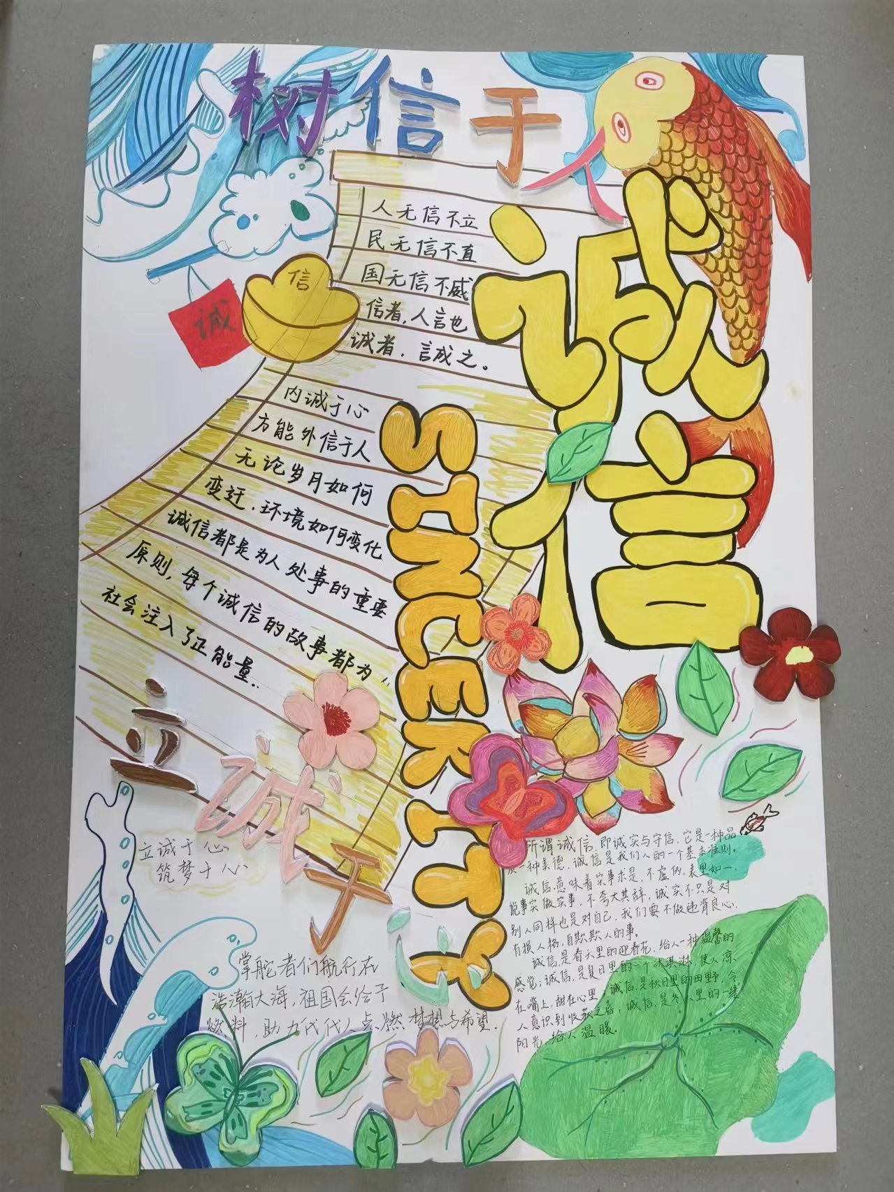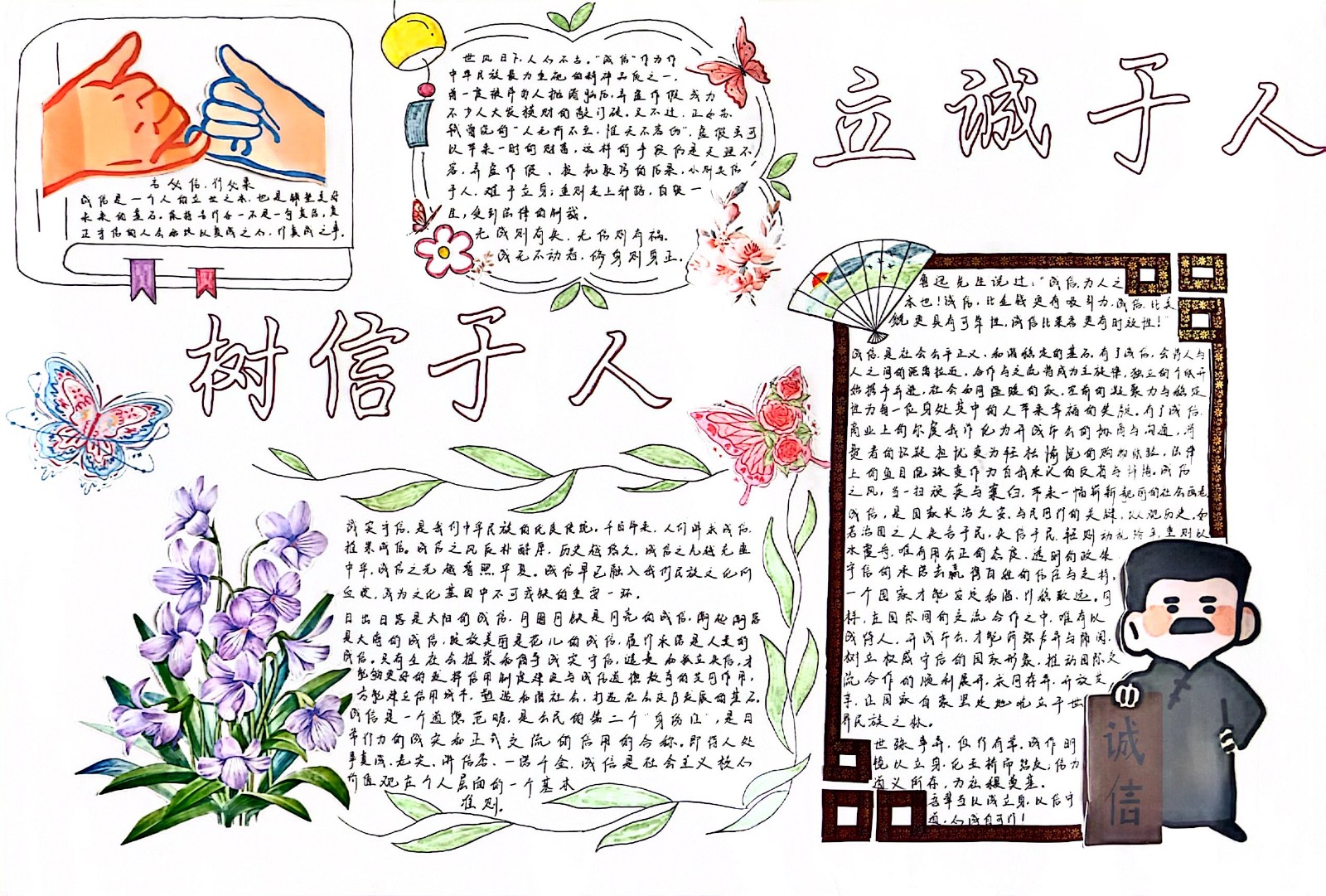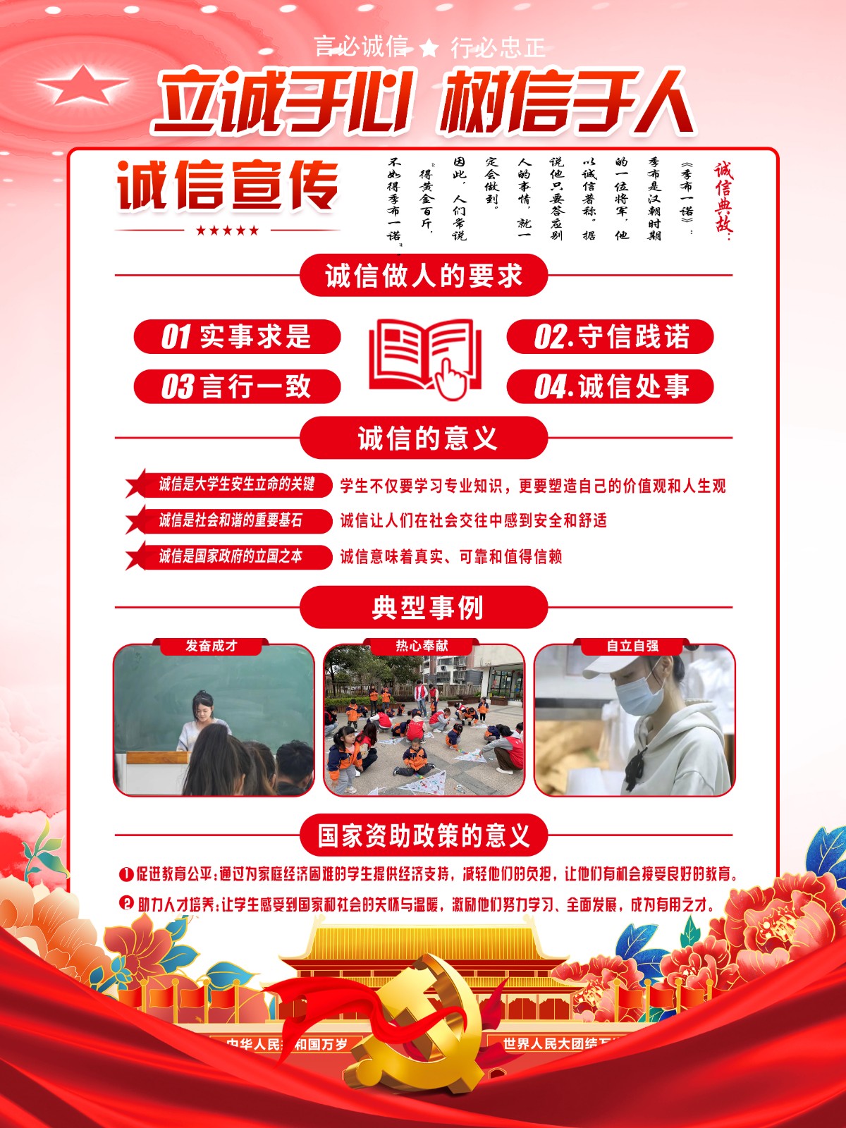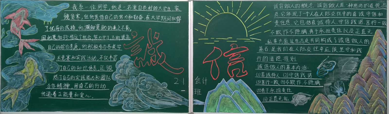 经济系积极响应学院2024年诚信教育月主题活动的号召,组织制作以“立诚于心,树信于人”为主题的资助诚信教育板报活动。此次活动旨在通过板报这一传统与创意相结合的形式,弘扬诚信精神,引导学生们树立正确的资助诚信观念,促进校园诚信文化建设。