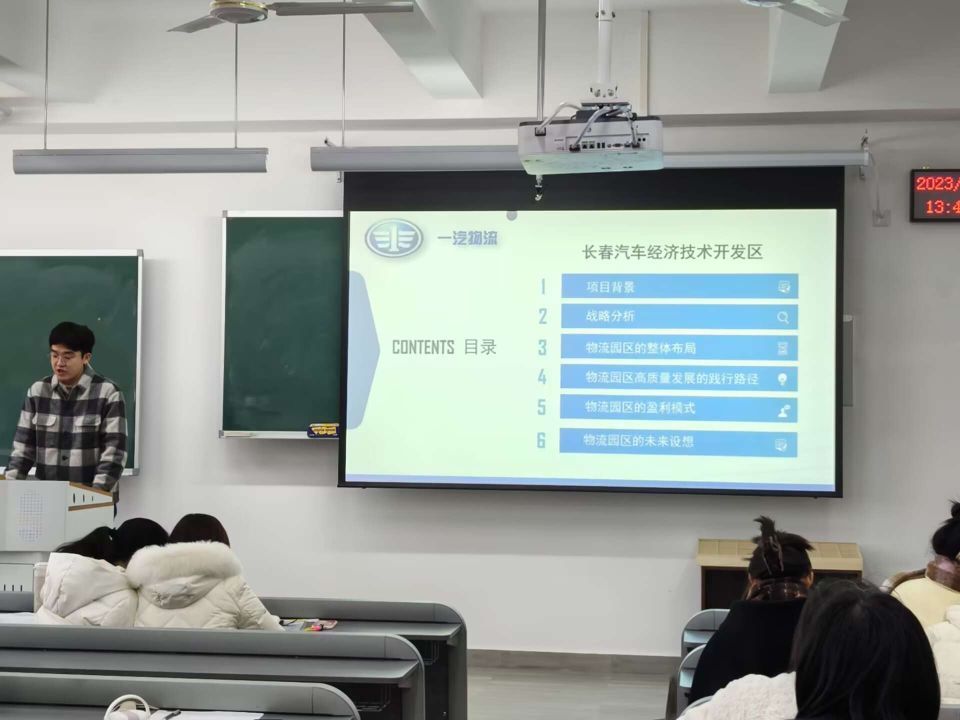 本次比赛通过笔试、PPT设计方案汇报、参赛选手现场答辩、评委点评及打分等方式进行评比。现场答辩环节中,共11支队伍参加,他们从容不迫地汇报,评委老师们公正细致地点评,给我们带来一场精彩纷呈的物流设计盛宴。最终,成立超率领的竞速时代队的参赛作品《长春汽车经济技术开发区物流园区高质量发展的践行之路》获得一等奖;王硕率领的云海乘风队的参赛作品《一汽物流科技化和国际化转型方案设计》、陈佳乐率领的鱼而不愚队的参赛作品《“双碳之战”——一汽物流新能源转型优化方案》获得二等奖;刘诗雨率领的BANG队的参赛作品《一汽集团的“数智化提质”计划》、潘晓婷率领的对对对队的参赛作品《长春汽开区智慧物流园区的高质量转型之路》、孙雅文率领的swt队的参赛作品《一汽物流全链路战略研究分析》获得三等奖。