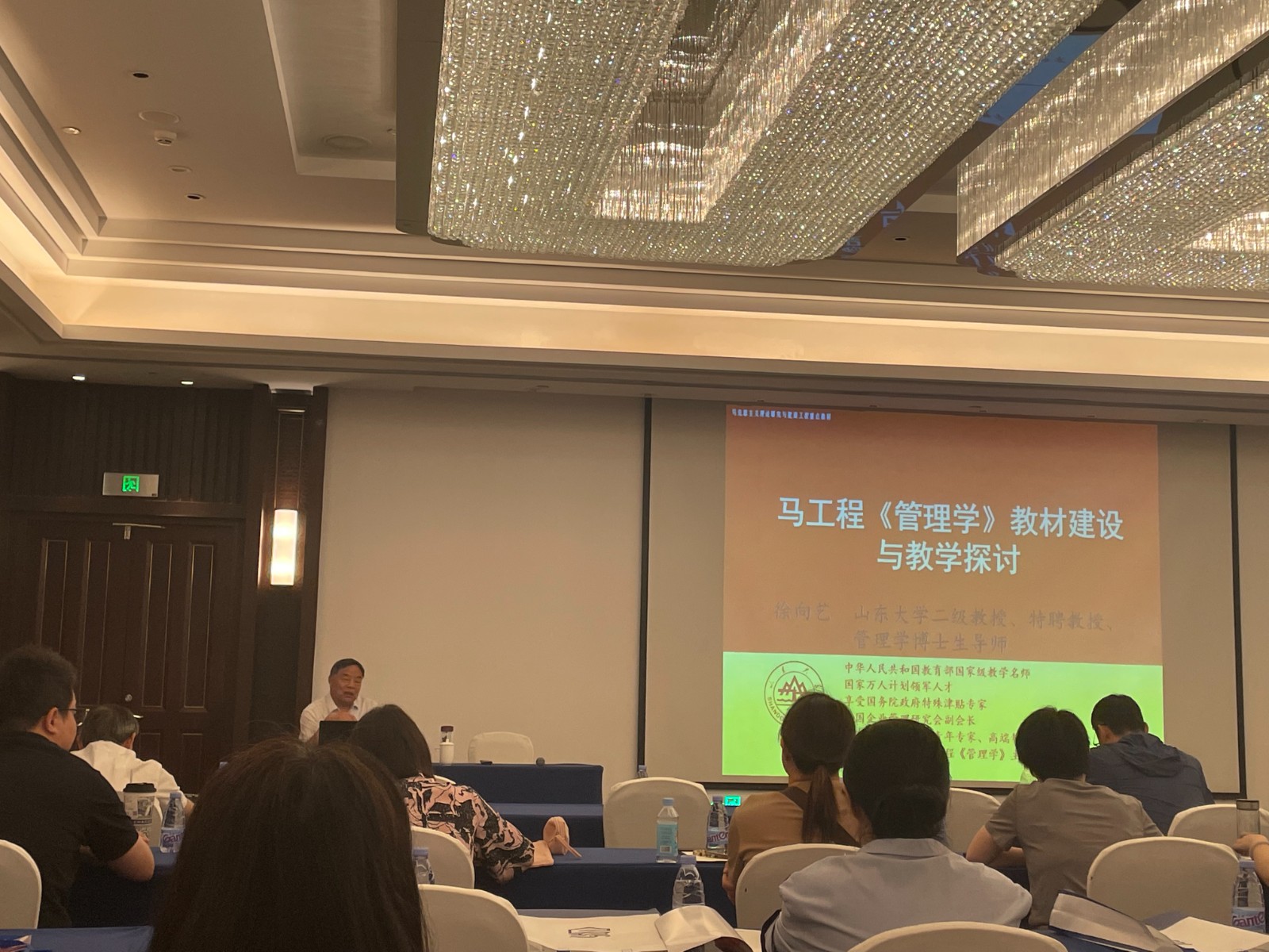 本次会议分为上午场和下午场,上午场的会议主题内容分别为:开辟教材建设新领域、塑造教育发展新动能——基于高教社的数字教材建设实践与思考;高校哲学社会科学教材建设情况交流;培根铸魂,启智增慧——新时代精品教材建设思考与探索。下午场分为《习近平法治思想概论》、《管理学》、《艺术学概论》三个分会场同时进行,我系专职教师李裕吉参加了《管理学》分会场。《管理学》分会场会议由山东大学徐向艺教授主讲,徐向艺教授针对马工程《管理学》的教材建设与教学探讨与参会教师共同交流。首先,徐向艺教授从教材建设的指导思想需以马克思主义科学理论为基本指导思想、借鉴和传承国外优秀理论成果、汲取传统文化与智慧的营养、总结改革开放40多年我国管理学理论进展、必须结合中国管理实践等方面展开;其次,对《管理学》教材体系与结构设计、教材的反思、《管理学》篇章结构等内容逐一详细讲述;最后,徐向艺教授与在场的教师们围绕《管理学》课程的内容及教学方法进行了现场互动交流。