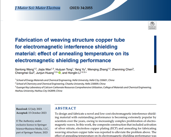 近日,“中心”超细粉体制备与应用团队成员李宏林教授指导2021级硕士研究生王三龙和张文庆在性能优异的新型低成本电磁干扰屏蔽材料研究中取得新进展,相关成果以“Fabrication of weaving structure copper tube for electromagnetic interference shielding material: effect of annealing temperature on its electromagnetic shielding performance”为题发表在国际权威期刊《J Mater Sci: Mater Electron》(SCI收录,IF:2.779),以“Fabrication of Textile-based Triboelectric Nanogenerator toward high-efficiency energy harvesting and material recognition”为题发表在国际权威期刊《Mater Horiz》(SCI收录,IF:13.3),以“Fabrication of triboelectric nanogenerators with multiple strain mechanisms for high-accuracy material and gesture recognition”为题发表在国际权威期刊《J. Mater. Chem. A》(SCI收录,IF:11.9)。
