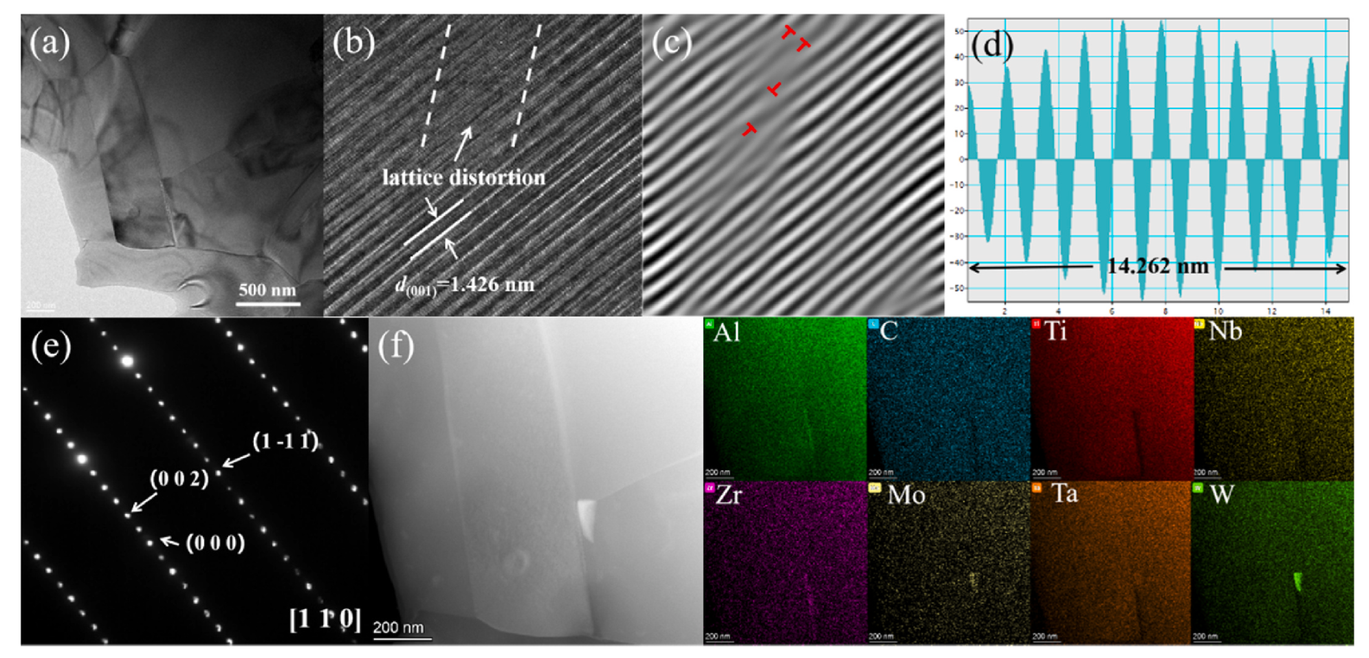 该工作打破了常规高熵MAX相的固溶方式,采用过渡金属碳化物为固溶源,通过快速热压烧结,成功的制备出高纯度六组元固溶的M位高熵MAX陶瓷,其混合熵为1.47R。通过XRD,SEM和TEM等分析手段,证明了高熵MAX相存在较大的晶格畸变和较多的位错,并且具有很高的损伤容限。此材料的维氏硬度,抗弯强度和断裂韧性分别为9.3 ± 0.2 GPa, 433 ± 27 GPa, and 8.9 ± 0.3 MPa m1/2,均高于单相Ti2AlC陶瓷,显示出高熵化对于材料力学性能的极大提升。