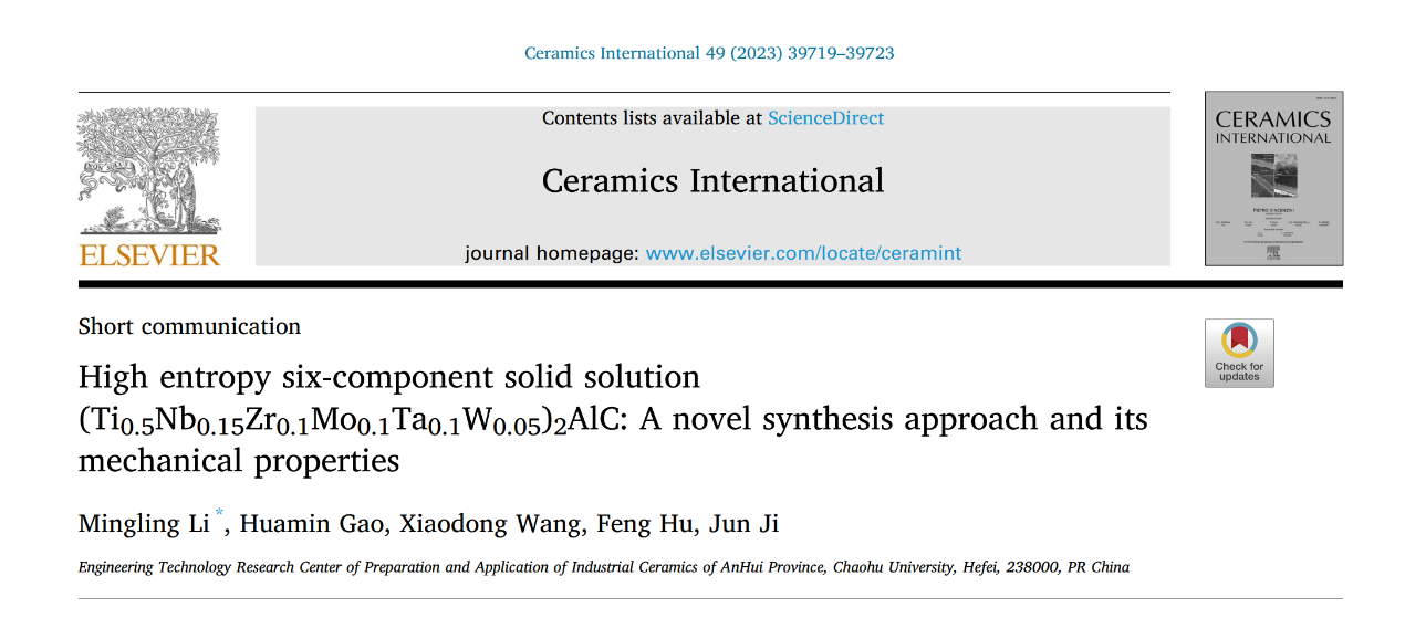近日,陶瓷材料制备与应用团队李明玲教授在高熵MAX相陶瓷制备中取得一定进展,相关成果以“High entropy six-component solid solution (Ti0.5Nb0.15Zr0.1Mo0.1Ta0.1W0.05)2AlC: A novel synthesis approach and its mechanical properties”为题发表在国际权威期刊《Ceramics International》(中科院二区,IF:5.2)