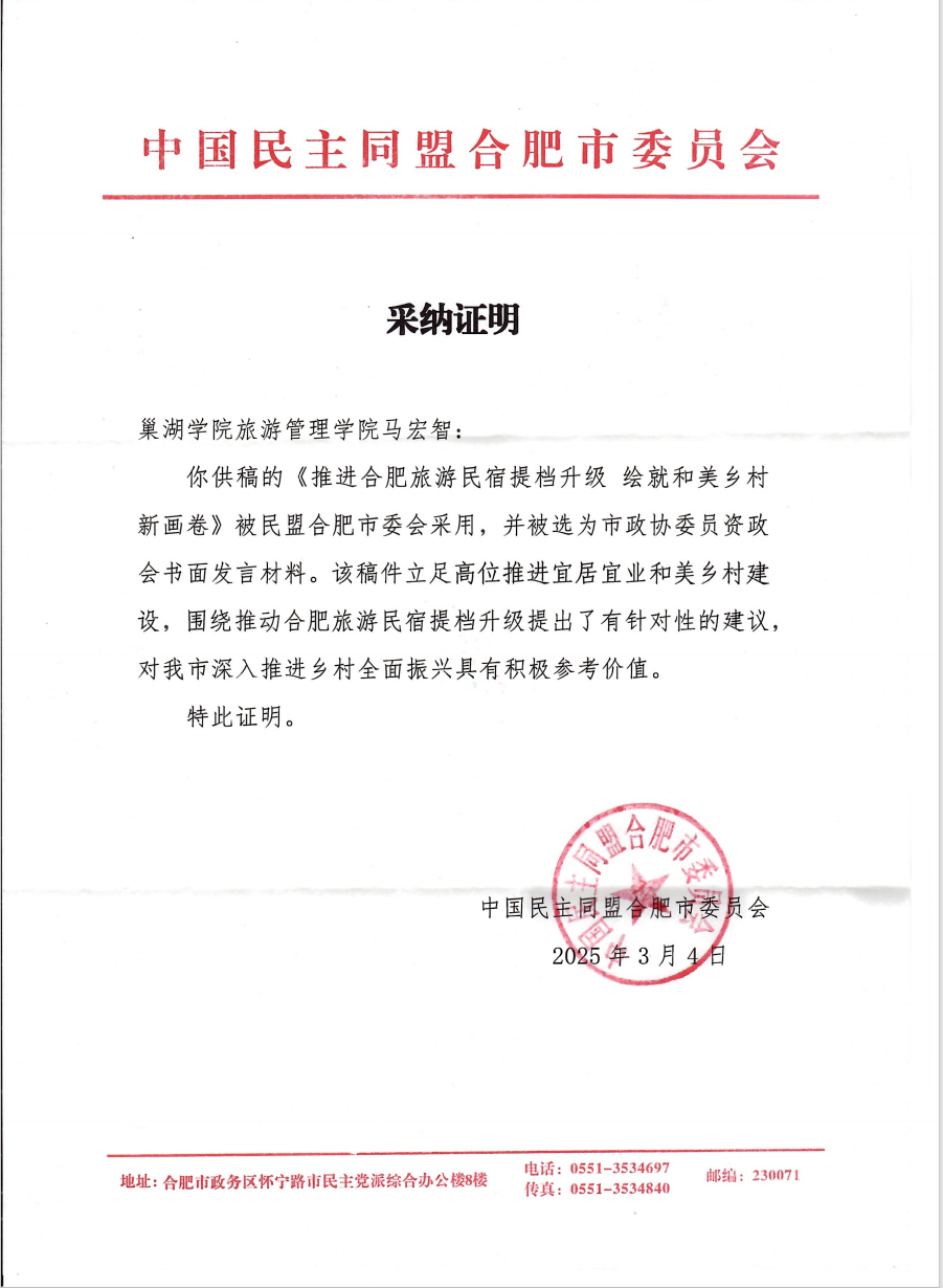 近期,环巢湖研究中心马宏智博士团队完成的《推进合肥旅游民宿提档升级绘就和美乡村新画卷》被民盟合肥市委采用,并被选为市政协委员咨政会书面发言材料。该报告立足合肥市民宿发展起步较晚、发展不平衡不充分的基本情况,针对存在的主要问题,提出充分调研,摸清家底,多样化评估;统筹全局,规划先行,差异化布局;政策引导,行业规范,示范性引导;深挖文化,体现特色,在地化运作等政策建议,对合肥市深入推进乡村全面振兴具有积极参考价值。(文/马宏智 图/民盟合肥市委 初审/朱学同 终审/雷若欣)