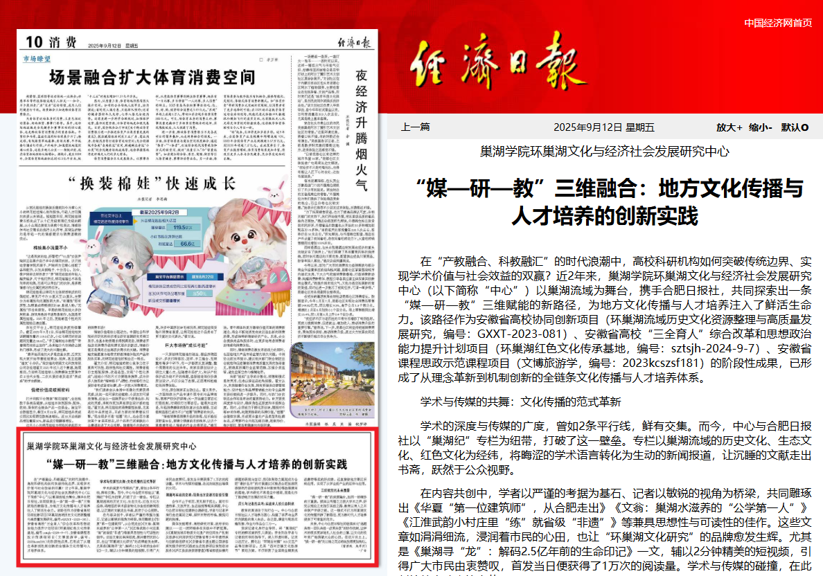 9月12日,《经济日报》以《必赢76net官网环巢湖文化与经济社会发展研究中心:“媒-研-教”三维融合:地方文化传播与人才培养的创新实践》报道了必赢76net官网环巢湖文化与经济社会发展研究中心与合肥日报社集团共谋、共创、共享地方文化传播与人才培养的做法和成效。