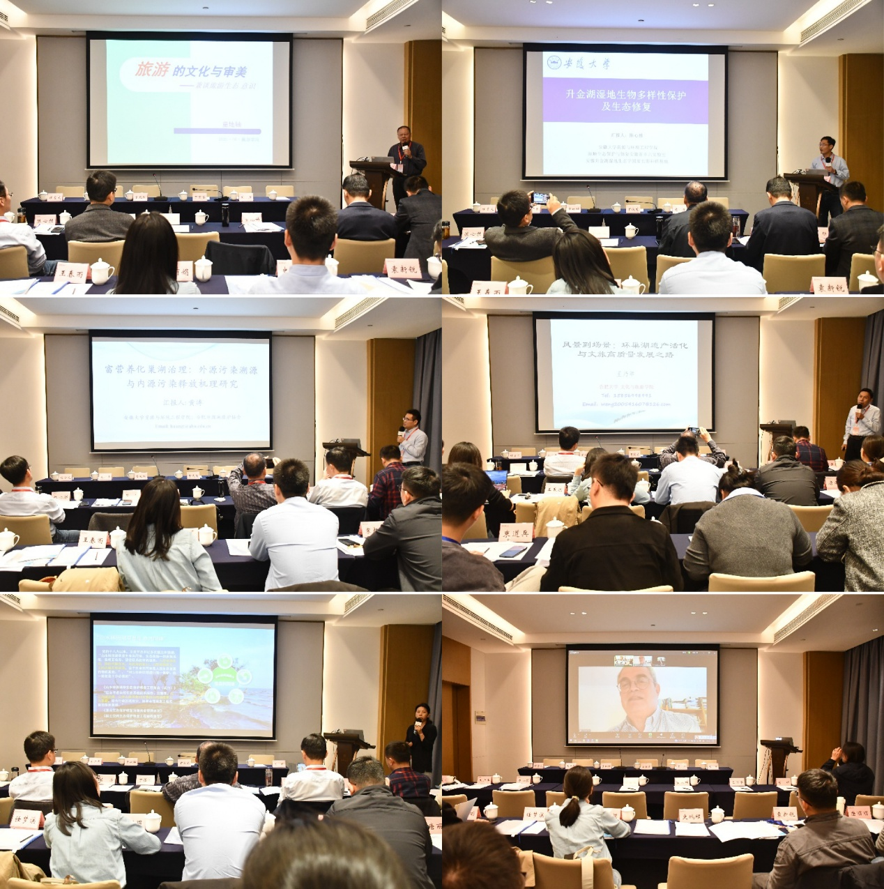 主旨报告部分由朱明教授主持,安徽大学陈心胜研究员、黄涛教授、安徽省旅游学会童地轴教授、合肥大学王乃举教授、安徽省巢湖管理局山水办项目负责人朱广平、葡萄牙莱里亚理工大学的Prof. Francisco Dias教授。分别作了《升金湖湿地生物多样性保护与生态修复》《旅游的文化审美——兼谈旅游生态意识》《富营养化 巢湖治理:外源污染溯源与内源污染释放机理研究》《风景到场景:环巢湖遗产活化与文旅高质量发展之路》《整体谋划系统实施推进巢湖流域山水林田湖草一体化保护和修复》《Monitoring tourism impacts as a first step for tourism sustainability in lake basins》等6场主旨报告。