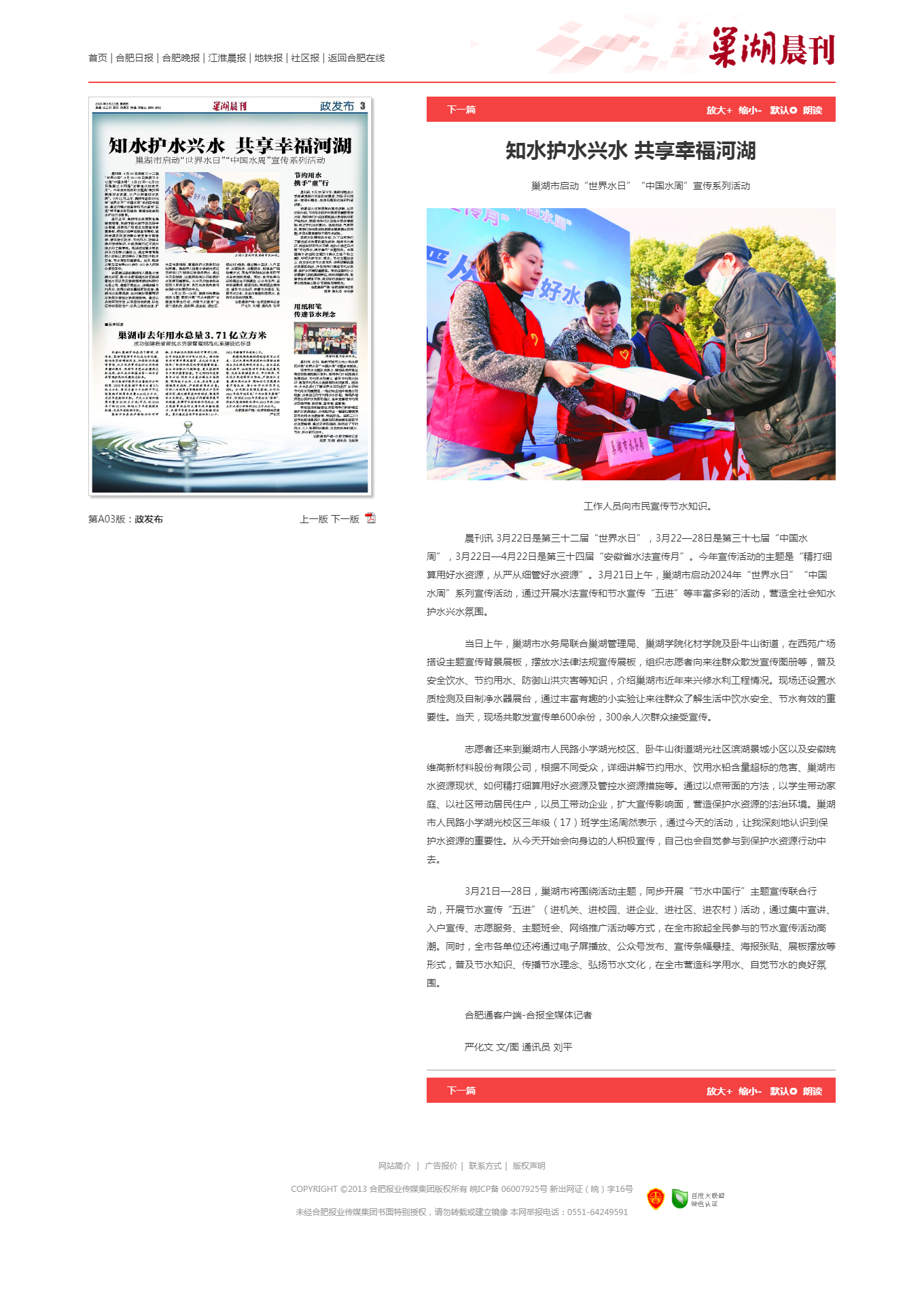为深入贯彻落实习近平总书记关于水资源节约集约利用的重要指示和“节水优先、空间均衡、系统治理、两手发力”新时期治水思路,在第三十二届“世界水日”、第三十七届“中国水周”暨第三十四届“安徽省水法宣传月”之际,必赢76net官网化学与材料工程学院与巢湖市水务局等单位于3月21日,在巢湖市西苑广场、人民路小学湖光校区、安徽皖维高新材料股份有限公司等地共同开展“精打细算用好水资源,从严从细管好水资源”志愿服务暨水法宣传活动。