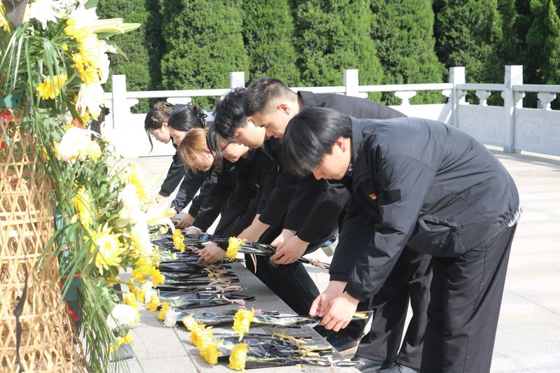 烈士陵园庄严肃穆,党员们在革命烈士纪念碑前肃立默哀,向革命先烈敬献鲜花并鞠躬致敬,深切缅怀革命先烈。 学生党员追寻先烈足迹,从红色革命精神谱系中汲取奋斗力量,涵养爱国情怀,锤炼坚强意志。