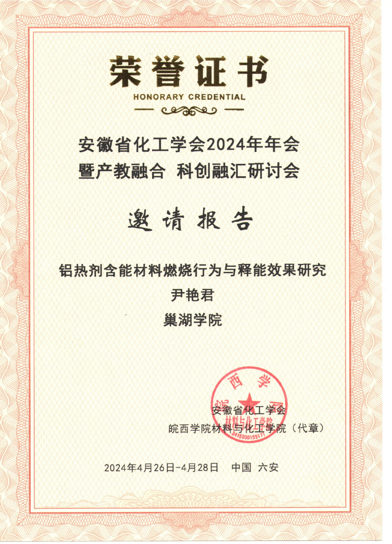 中国科技大学教授徐铜文、南京理工大学教授钟秦、东华工程科技股份有限公司总工程师喻军等专家分别作大会主旨报告。专题报告第一阶段,合肥工业大学教授陆杨、安徽师范大学教授方臻、安徽大学苗继斌、安庆师范大学教授王钧伟等专家就产教融合、专业建设、化工类专业课程的改革与应用型人才的培养等方面内容作了报告;专题报告第二阶段,安徽大学郭立升、安徽理工大学毛立睿、合肥大学王青等专家就科创融汇与科技创新等方面作了相关学术报告。我校化材学院尹艳君老师在“科创融汇、科技创新”专题报告中作题为“铝热剂含能材料燃烧行为与释能效果研究”学术报告,受到在场学者的广泛关注。