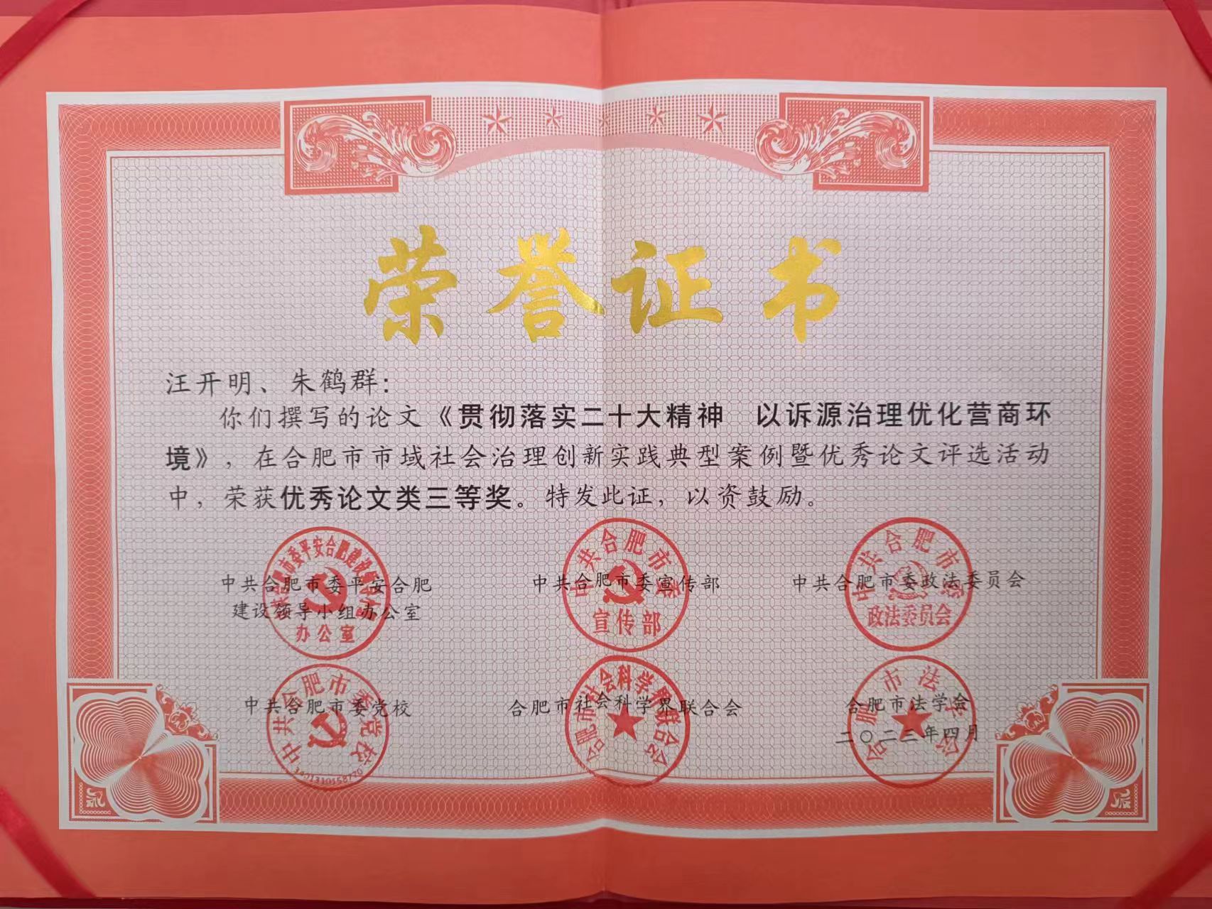 合肥市市域社会治理创新实践典型案例暨优秀论文评选“优秀论文类三等奖”