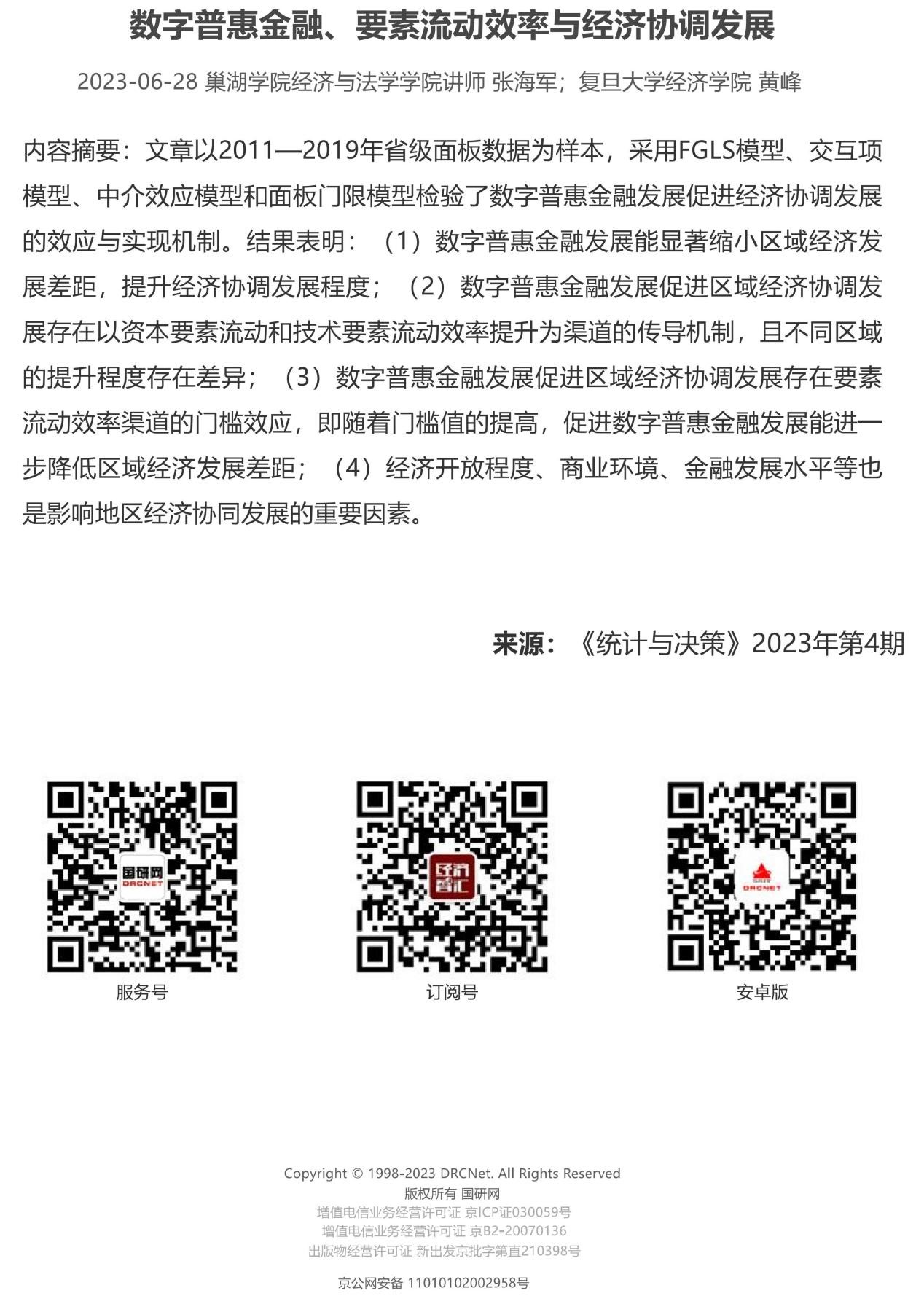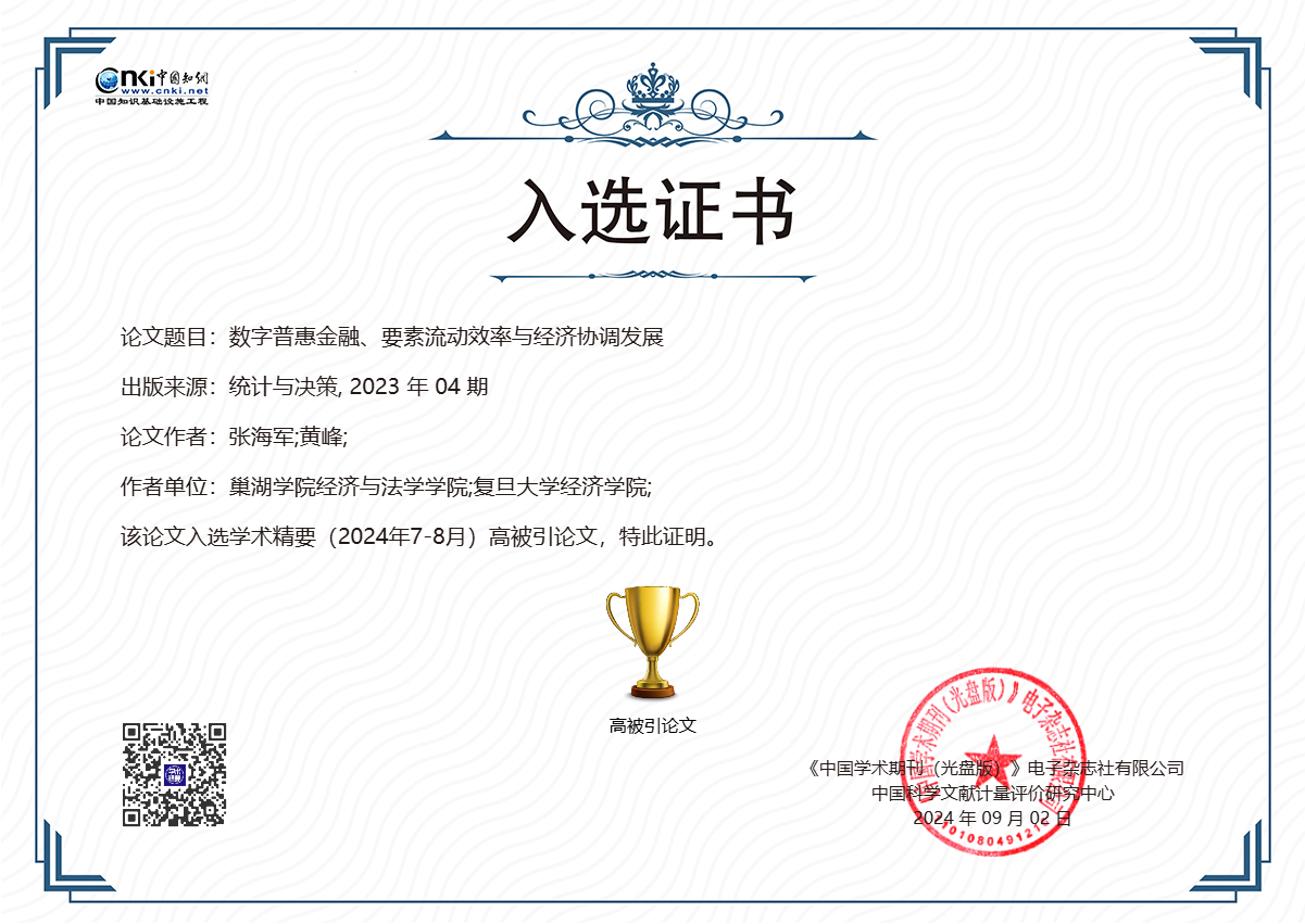 根据中国知网中国科学文献计量评价中心的数据显示,必赢76net官网经济与法学学院张海军博士于2023年以必赢76net官网为第一单位在《统计与决策》(CSSCI来源期刊,影响因子:3.912)发表的论文《数字普惠金融、要素流动效率与经济协调发展》成功入选学术精要(2024年7-8月)高被引论文,且该文早前已被国务院发展研究中心信息网(国研网)转载。