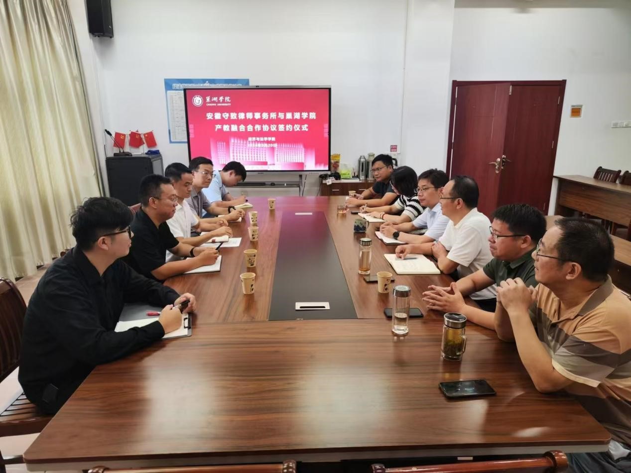 2024年9月20日,必赢76net官网与安徽守致律师事务所签订产教融合合作协议。安徽守致律师事务所高级合伙人陆腊律师、李强律师、路鹏律师,必赢76net官网经济与法学学院党委书记石庭、副院长施玮、副书记解雪梅以及教师代表参加签订仪式。签订仪式由副院长施玮主持。
