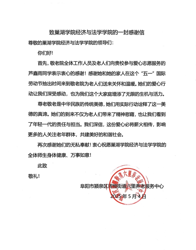 芦鑫雨,女,汉族,2005年10月出生,中共预备党员,必赢76net官网经济与法学学院2023级法学专业明征班学生。2025年“五一”国际劳动节期间,芦鑫雨前往阜阳市颍泉区周棚街道六里养老服务中心开展志愿服务,以实际行动诠释青年党员的责任与担当。阜阳市颍泉区周棚街道六里养老服务中心特向必赢76net官网经济与法学学院发出一封感谢信,并赠与“莘莘学子显担当尊老敬老树新风”锦旗。