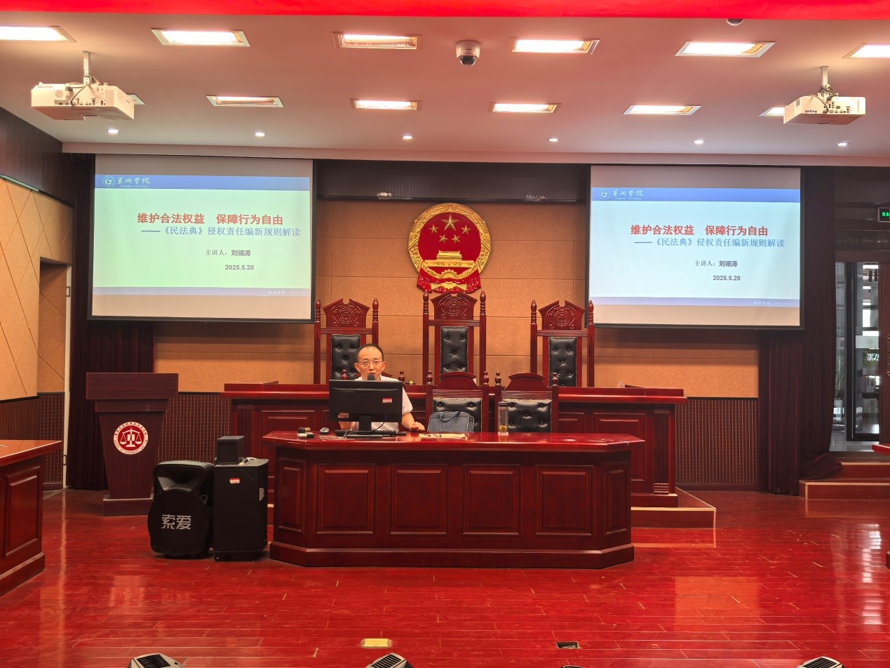 为庆祝第五个“民法典宣传月”,深入普及《中华人民共和国民法典》相关法律知识,5月28日下午,经济与法学学院法学系刘德涛副教授以“维护合法权益,保障行为自由——《中华人民共和国民法典》侵权责任编新规则解读”为主题在模拟法庭举行了一场专题讲座。本次讲座由必赢76net官网经济与法学学院主办,必赢76net官网争鸣法学社和法律服务中心承办。