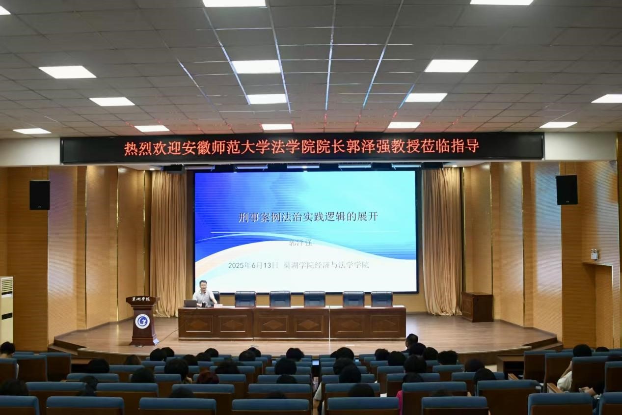 为助力学生精准把握刑事司法前沿动态,夯实专业知识储备,深化法学领域学术交流,经济与法学学院于6月13日下午在求实楼报告厅开展“刑事案例法治实践逻辑的展开”专题学术讲座,本次讲座邀请安徽师范大学法学院院长郭泽强教授作专题报告,副院长施玮主持,法学专业学生参加。