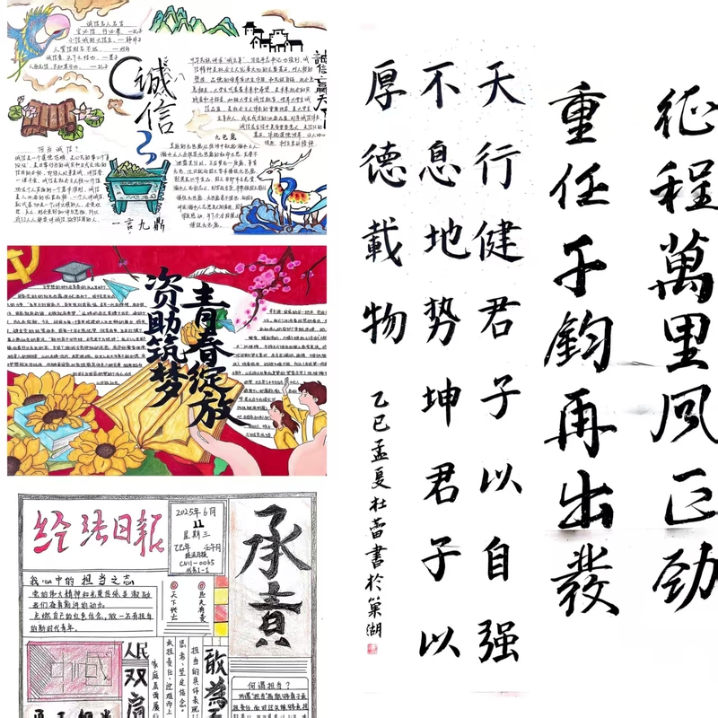 活动开展以来,得到全院学生积极响应,共征集书法、绘画、手抄报等作品百余件。硬笔书法作品工整隽秀,“诚信为本,助学圆梦”等语句苍劲有力;软笔书法作品行云流水,以楷行草不同字体,书写对国家资助政策的赞颂;手抄报作品创意无限,多变的排版、鲜艳的色彩,将助学贷款政策、励志成长故事等内容巧妙呈现;绘画作品独具匠心,水彩画《生逢其时,强国有我》展现出困难学子在资助关怀下逐梦未来的昂扬之姿。每一幅作品都饱含着学生对国家资助政策的感恩之情,以艺术的笔触生动诠释了资助育人的温暖力量。