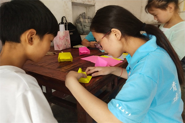 实践活动第四天,队员们为蚂蚁宝贝开设了一对一帮扶之手工课培训,看着队员们手里缤纷多彩的荧光折纸,蚂蚁宝贝跃跃欲试,仿照实践团队员的折法,创造出了一个个的千纸鹤,小灯笼以及纸飞机。经过一段时间的手工辅导,孩子们逐渐掌握了折纸的要领,一个个鲜活的作品逐一展现出来了,孩子们和实践团的成员们的关系也越发熟络起来。
