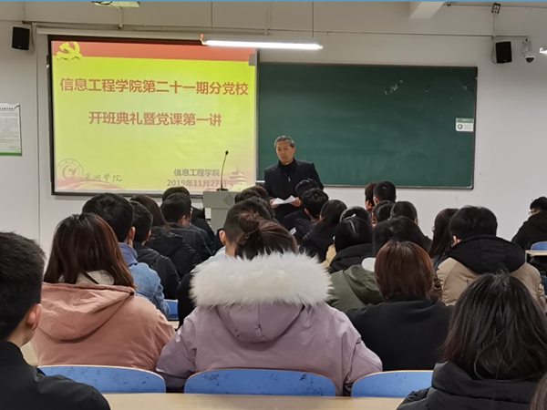 为加强对入党积极分子的培训,做好学生党员的发展工作,信息工程学院于2019年11月27日,中午12:30在慎思楼中104教室室举办2019年秋季(第二十一期)党课开班典礼暨党课第一讲,信息工程学院分党委书记陈士群、党课班主任樊乐乐及本期所有学员出席开班仪式。