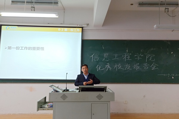 12月20日下午,信息工程学院在慎思楼中101举办了优秀校友报告会。1999届校友、上海勤润信息科技有限公司执行董事李世勤,应邀为同学们作报告。学院党委书记陈士群参加会议,报告会由学院团总支书记刘小燕主持,学院各班级优秀学生代表参加报告会。