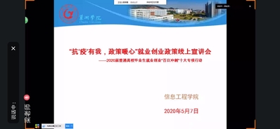 为全力做好信息学院2020届毕业生就业创业工作,减轻同学们在疫情影响下就业择业创业的焦虑心理,及时传达国家相关就业创业政策精神,学院毕业班辅导员刘小燕、樊乐乐和学院就业联络员梁腾飞于5月7日在学院毕业生就业QQ群、班级QQ群开展“抗‘疫’有我,政策暖心”就业创业政策线上宣讲会,为毕业生介绍2020届普通高校毕业生就业创业“百日冲刺”十大专项行动。