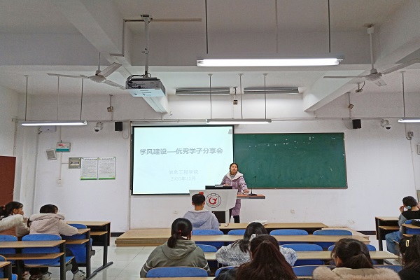 为做好新生的职业规划教育指导,营造良好的育人环境与学习氛围, 12月11日上午10:00,信息工程学院于慎思楼北201教室举行学风建设——优秀学子经验分享会。国家奖学金获得者——郭创业,校级一等奖学金获得者——郑子龙、郑国风,校优秀团学干部——徐莹,分别作了分享汇报。本次分享会由院辅导员陈文静主持,2020级各班级学生代表参加。