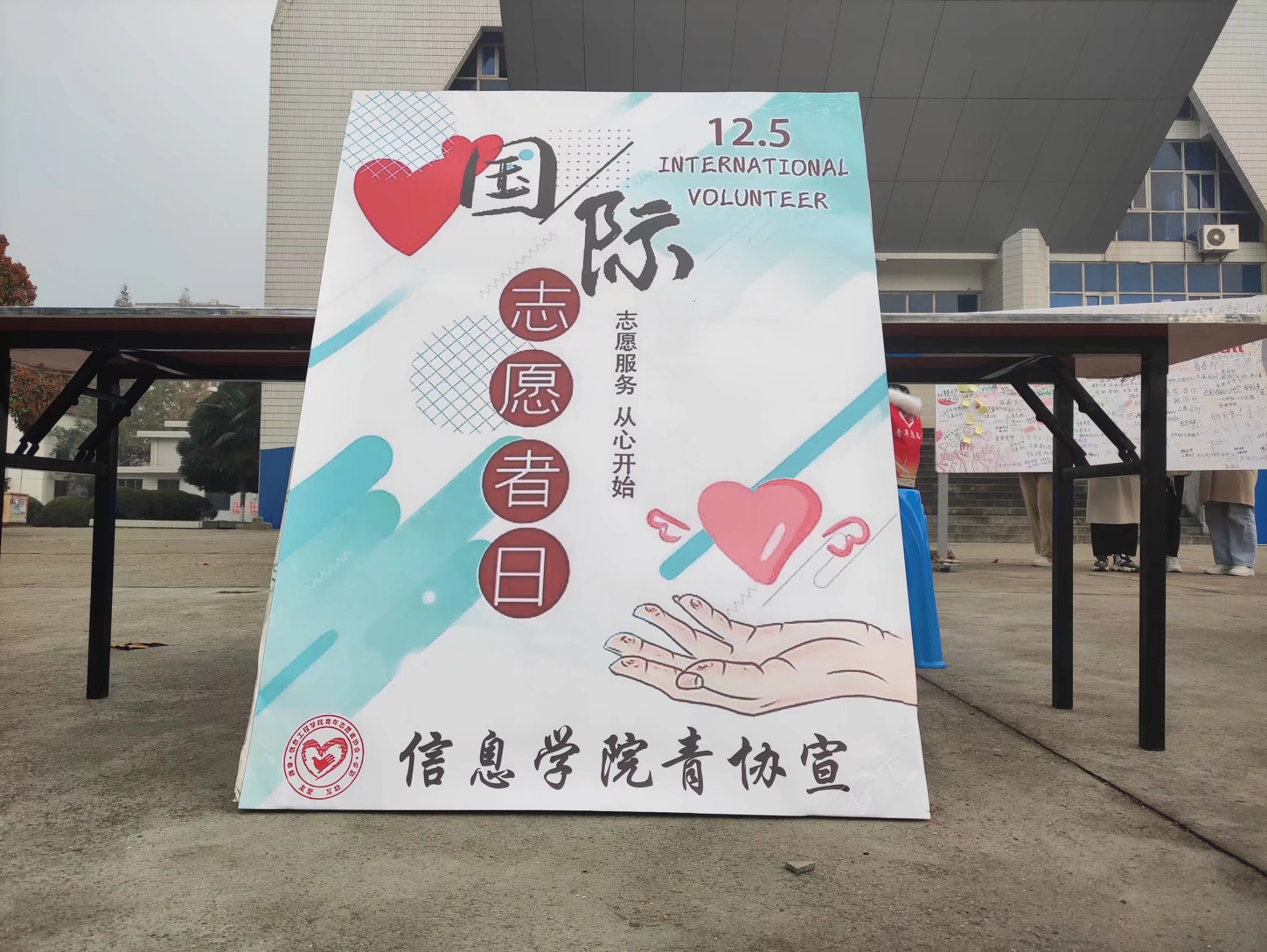 为弘扬志愿精神,展示我校青年志愿者行动的经验和成果,促进我校志愿者服务工作的发展,信息工程学院青年志愿者协会于12月3日至12月5日在校一食堂前举办以“志在心中,愿在行动”为主题的国际志愿者系列活动。
