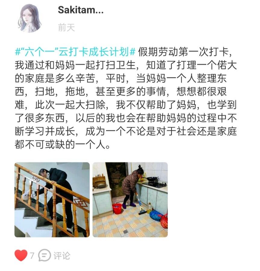 打卡一周假期劳动,提升一次劳动技能。勤劳是中华民族千百年来的行为倡导和传统美德,对劳动的肯定和赞美是中国传统文化的重要内容。为弘扬勤劳美德,传承民族文化,学院组织学生进行一周假期劳动。同学们纷纷化身劳动能手,洗碗洗筷、擦桌扫地、切菜做饭,尽自己的力量为家人分担家务,同时在线上共同分享劳动时光和成果,切身体会劳动的美丽和价值,树立正确的劳动观念。