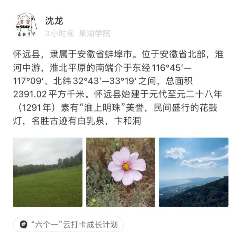 打卡一份家乡文化,宣传家乡人文情怀。最美不过家乡美,最甜不过家乡水。打卡一份家乡的文化,探寻家乡特色文化,感受最美家乡,做家乡文化的线上传播者和宣传员。19网络工程一班的赵城森来到家乡阜阳的六纺小吃一条街,探寻各式各样的阜阳特色小吃。19软件工程一班的张士闯以镜头记录家乡美景,积极宣传家乡的特色文化,展现自己家乡最美的风景。